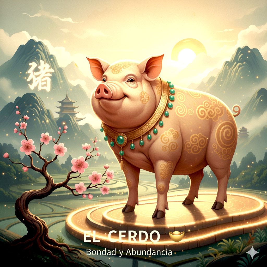 El Cerdo (a veces llamado Jabalí en algunas traducciones) es el duodécimo y último signo del ciclo, marcando el final de un recorrido y el inicio de la introspección. Representa la generosidad de espíritu, la satisfacción genuina y una profunda honestidad que puede ser casi ingenua. Es el alma noble que busca la paz y el bienestar para todos.
